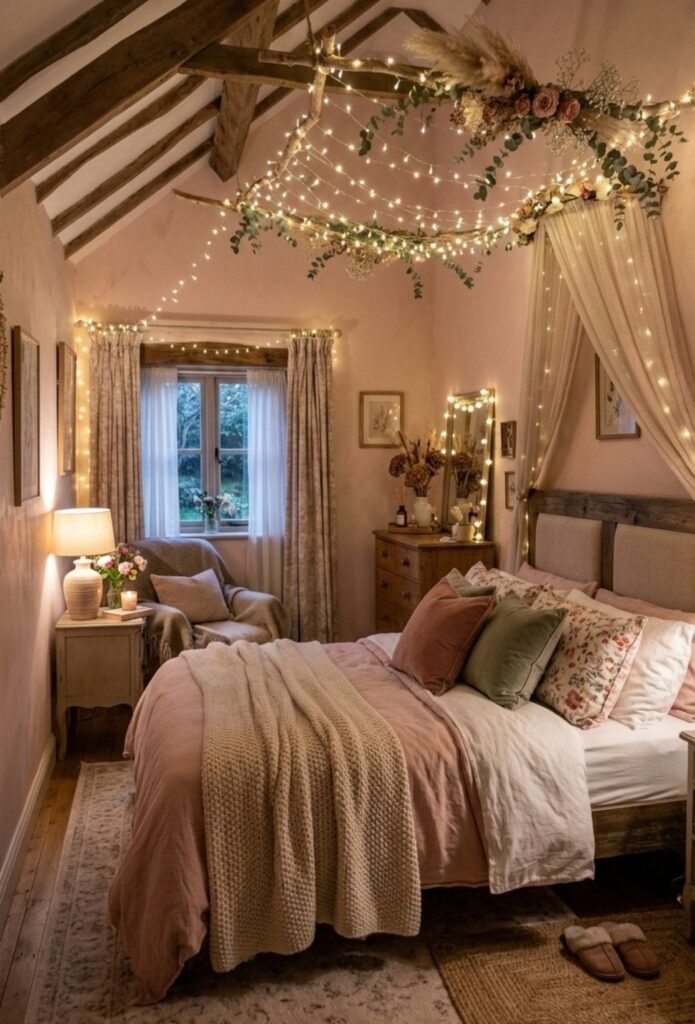 This bedroom feels straight out of a cozy countryside retreat. The soft blush walls, layered bedding, and exposed wooden beams give it that warm, relaxed charm. But what truly makes the space magical is the way the fairy lights are draped across the ceiling and around the bed canopy.