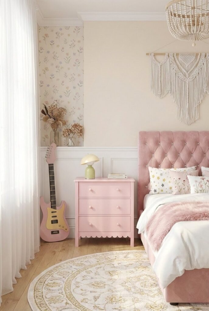 What makes it work so well here is how it ties in with the headboard and subtle pink accents around the room. It feels coordinated but not overly matched. The curved details and simple knobs give it that charming, slightly vintage feel that makes the whole setup look thoughtfully styled.
