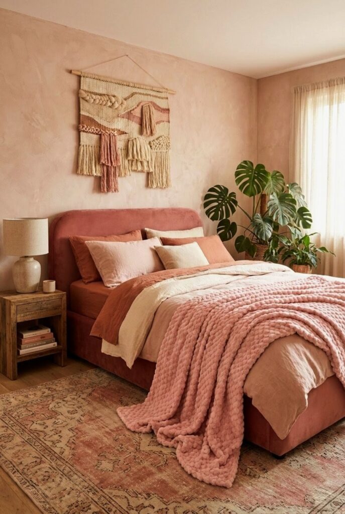 Blush walls paired with light wood furniture create a soft and airy base, but the real visual anchor in this room is the oversized macramé wall hanging. It brings texture, depth, and that effortless boho charm without making the space feel heavy.