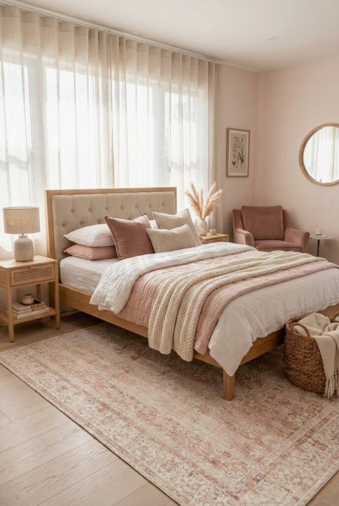Sometimes the biggest difference comes from the walls. This soft blush tone instantly makes the bedroom feel warmer, calmer, and more inviting. It’s subtle enough to stay neutral, but it adds just the right touch of femininity without feeling overly pink.